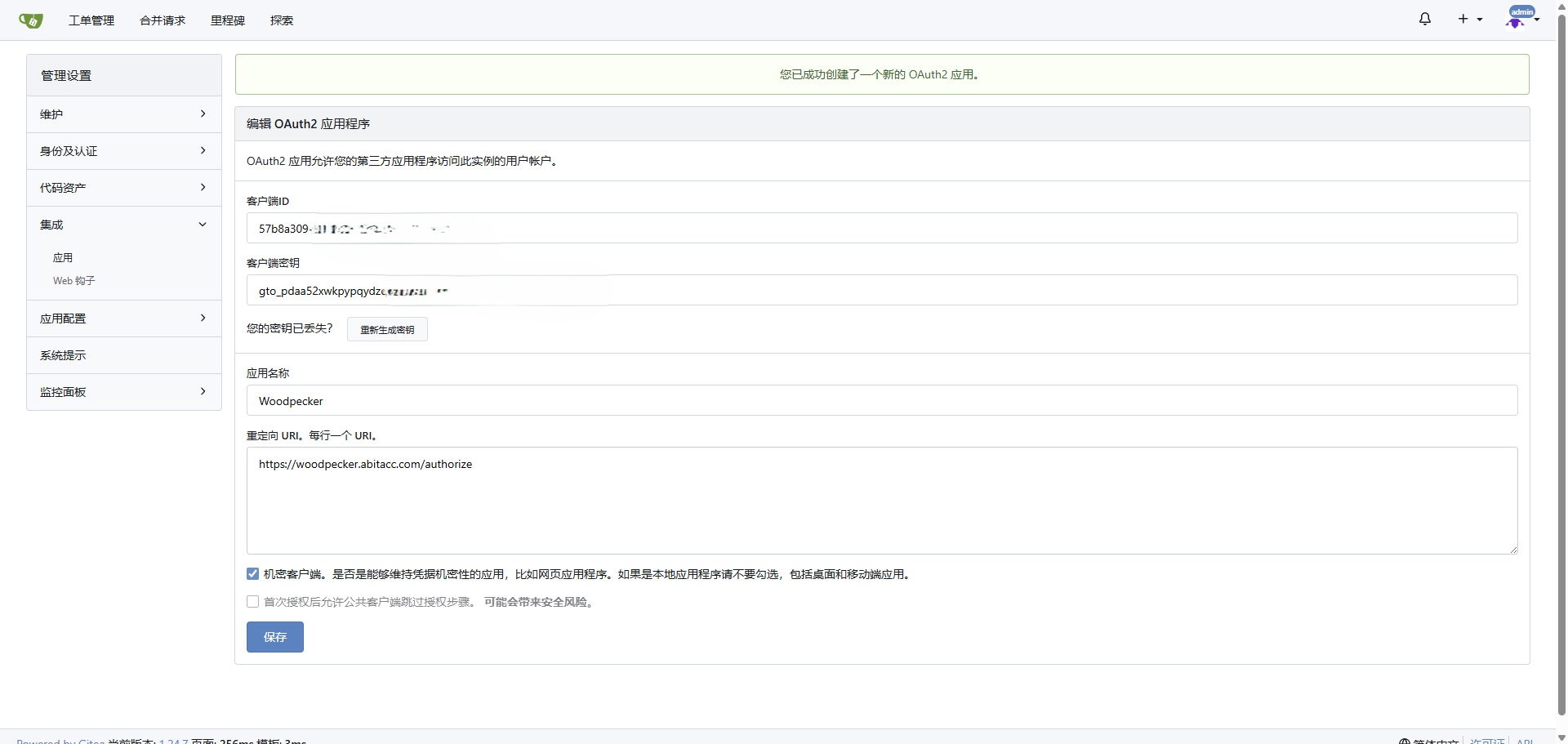 在gitea里面创建一个用于woodpecker的OAuth2应用: