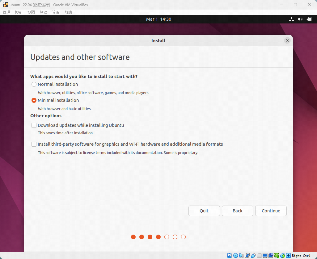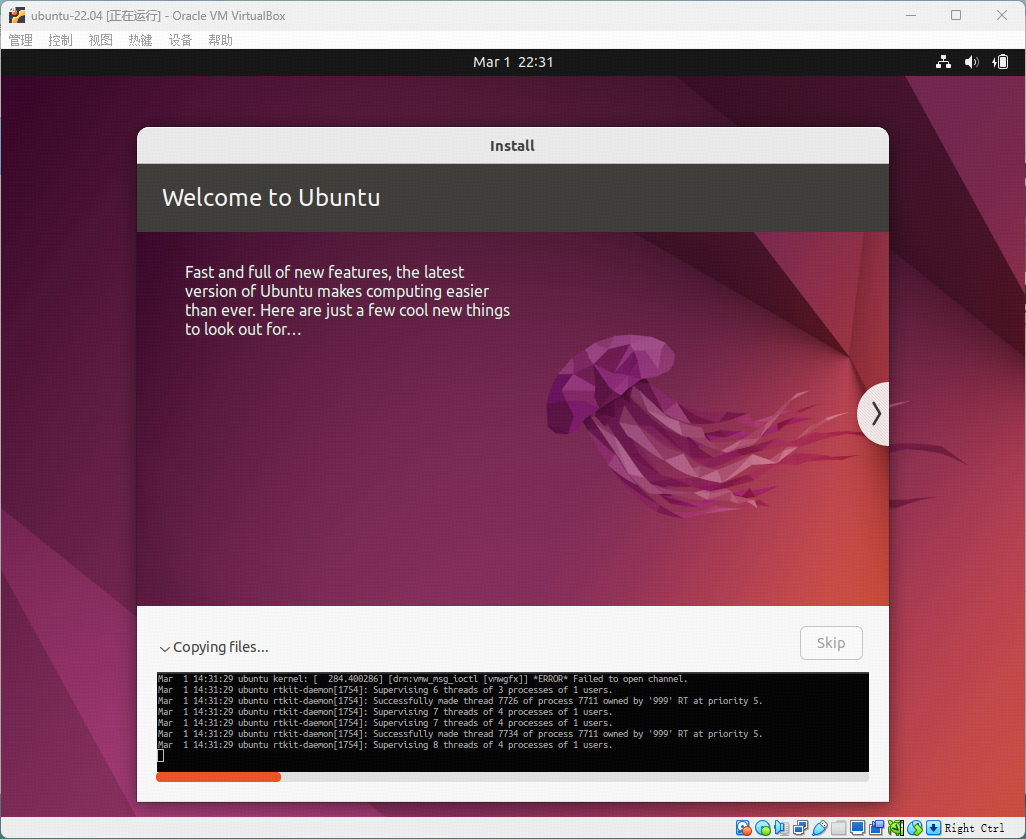 从Ubuntu Release页面下载ubuntu-22.04.1-desktop-amd64.iso镜像,然后启动Ubuntu-22.04 VM,挂载iso,进入Ubuntu部署引导页面,完成Ubuntu-22.04的安装。