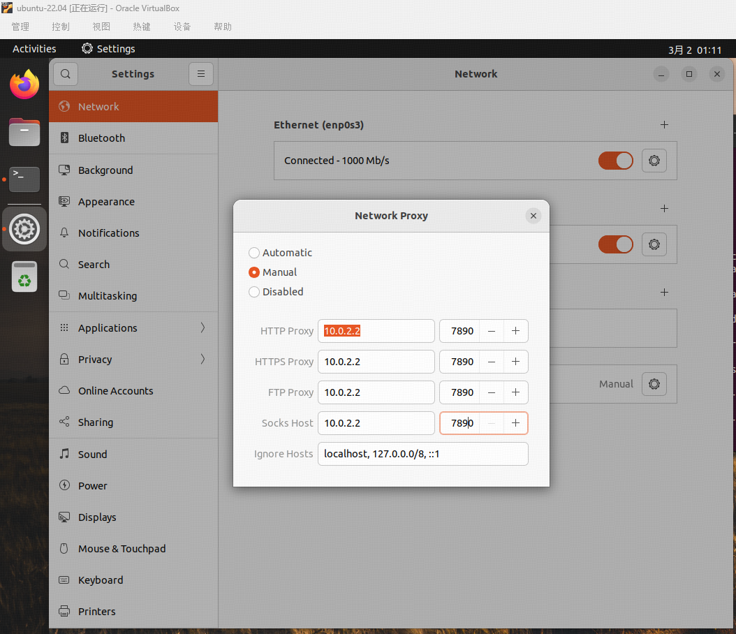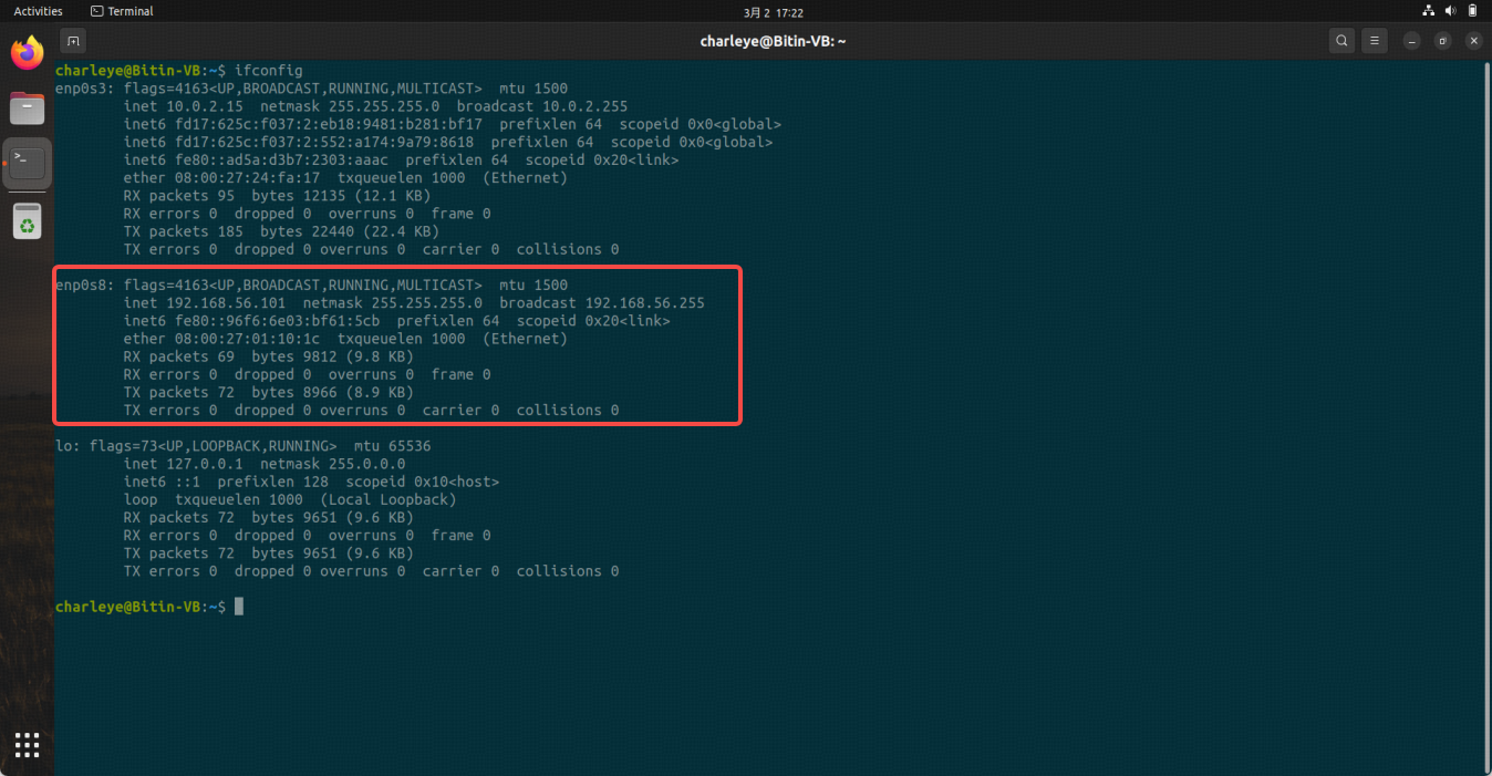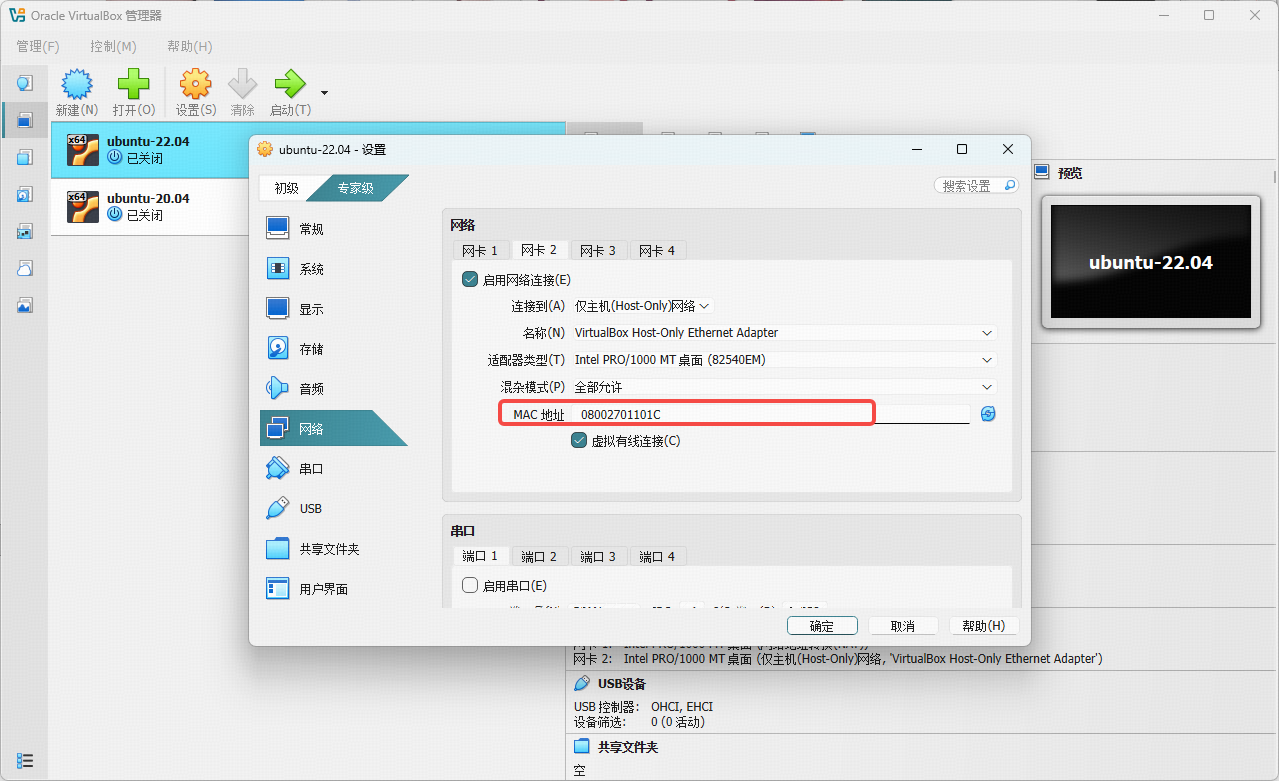配置Host-Only网络,这样host就能够通过这个接口访问Guest里面的服务, 进入Ubuntu终端输入ifconfig,查看新增网络接口的IP地址,在Host侧使用这个IP地址进行Guest的访问。