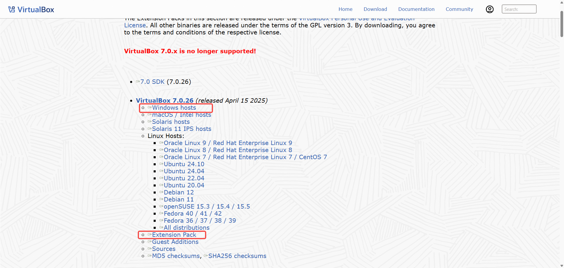 从VirtualBox Downloads页面选择并下载安装包和扩展包