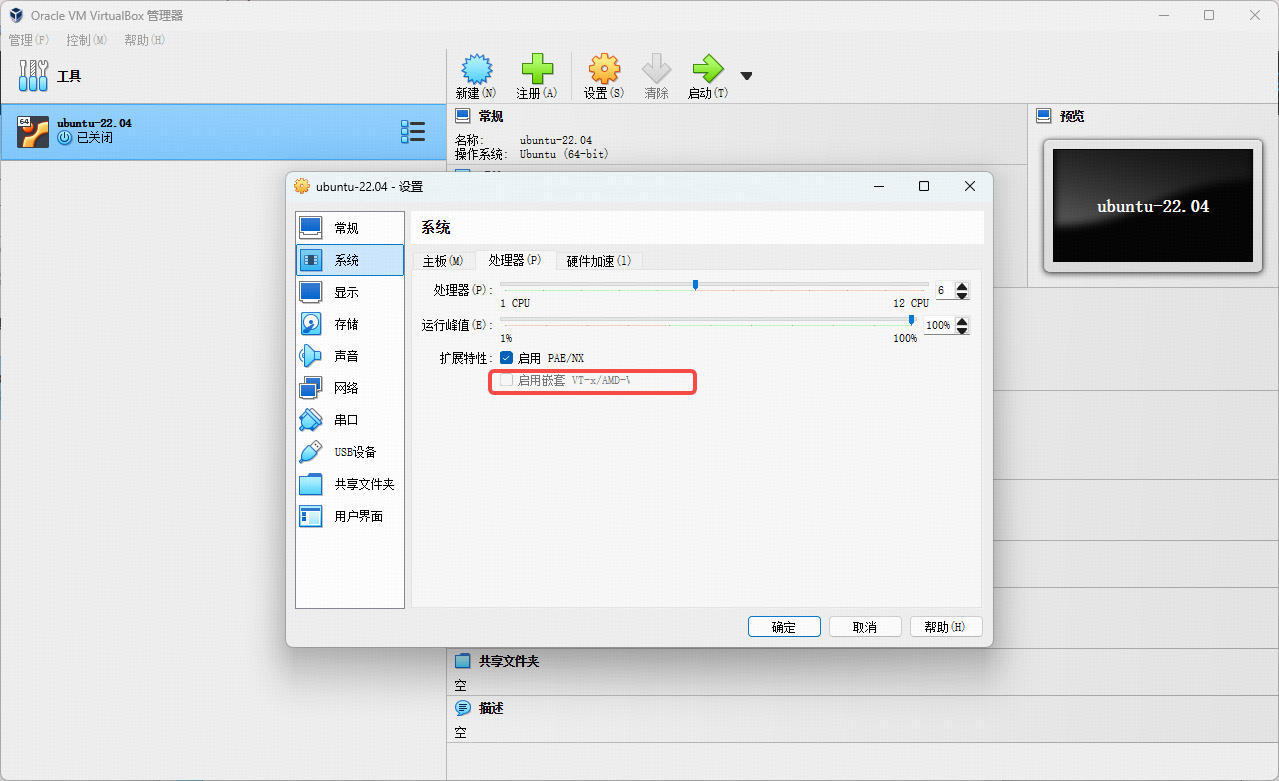 但存在一个问题:VM里面无法勾选“启用嵌套VT-x/AMD-V”选项,这个选项非常重要:用于加速虚拟设备处理速率,BIOS Setup里面提示已经开启了VT-d功能,但是VirtualBox VM配置界面却无法勾选。